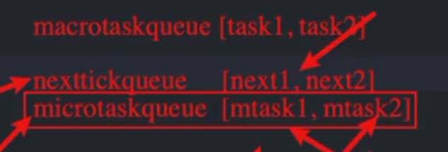 其实不会因为微任务队列中的内容运行时间都是很少的,所以在微任务之间不会先暂停。根本原因就是任务队列相互切换也是需要消耗性能的。微任务之所以称为微任务是由于耗时小,所以来回切换会增大Node.js的运行时间。所以只会在宏任务执行的时候去切换微任务,微任务执行的时候不会来回切换。会按照上图的顺序依次清空微任务队列然后再执行下一个红任务队列。